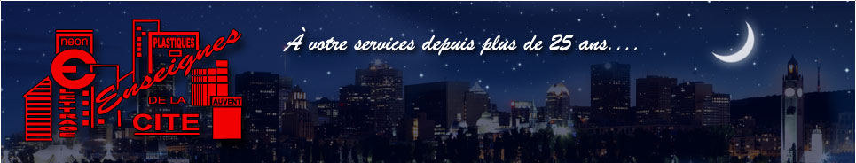 Fondée en 1984 par un Ferblantier et une commis comptable. Les Enseignes De La Cite fabriquent de tout genre D'ENSEIGNES, Lettrage sur des camions et voitures, du lettrage sur des chandails, des néons (choix de couleurs), enseignes en plastique et des auvents. Le lettrage était fait par des lettreur engagé à la pige. Plus tard nous avons commencé à acheter des machines pour découper le lettrage. Maitenant à la fine pointe de la tecnologie informatique et de la robotique. Soit pour reproduire un logo ou en créer un. Vous êtes un agent immobilier ? Cliquez ici